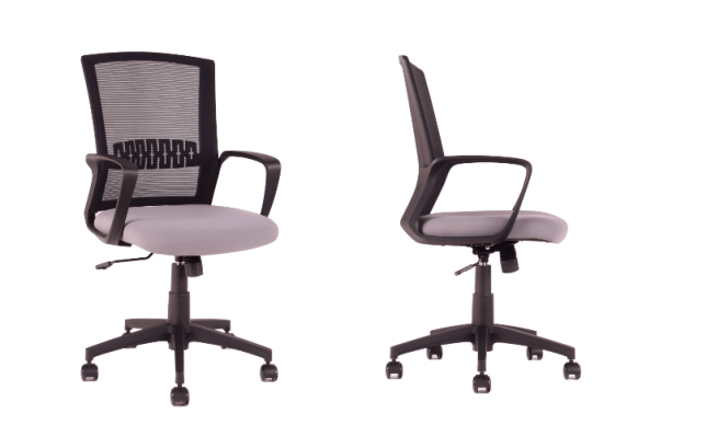 Silla Ejecutiva respaldo malla negra, asiento tapizado gris. Brazo fijo en polipropileno, mecanismo de reclinación, soporte lumbar. Ruedas PU.