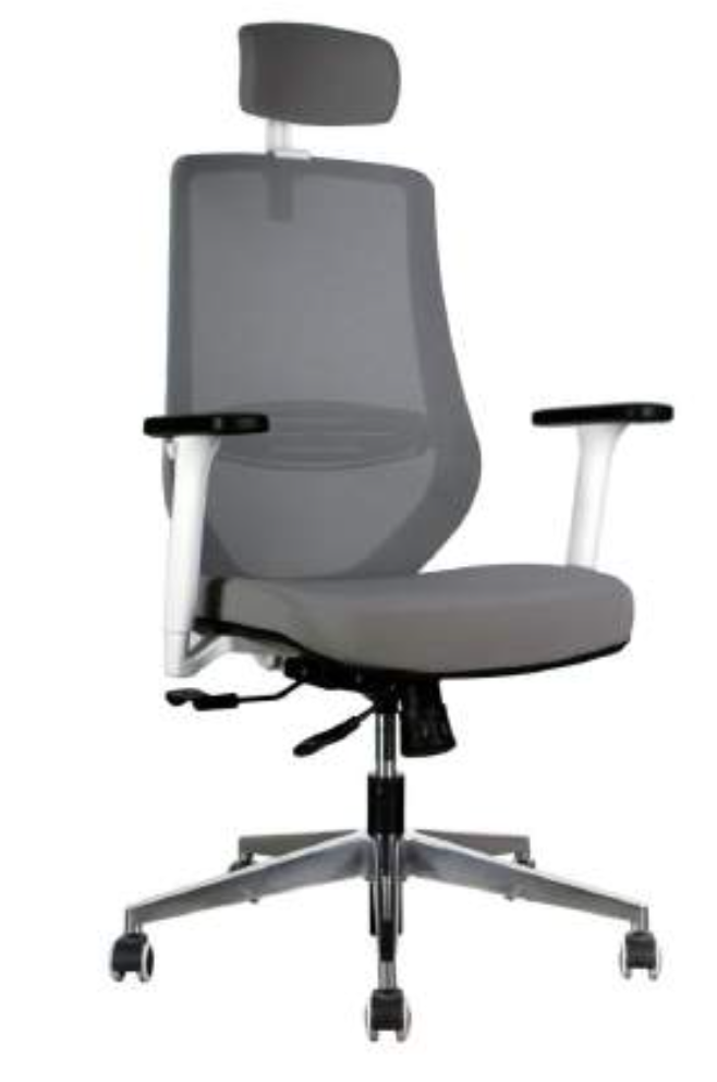 Silla de mecanismo sincrónico con desplazador de asiento, fijación en múltiples posiciones y sistema de tensión regulable. Apoyacabeza de tela gris ajustable en altura y ángulo. Respaldo de malla gris con soporte lumbar regulable en altura. Apoyabrazos de PU graduables en altura, ángulo y profundidad. Asiento de espuma inyectada tapizado gris, gas de 100 mm, base de aluminio 700 mm y ruedas de PU blancas de 50 mm.