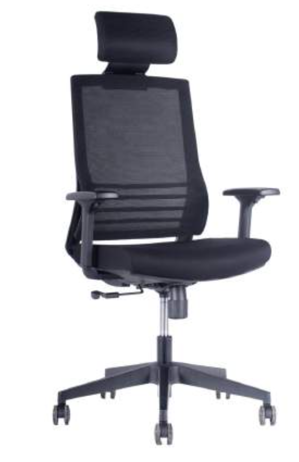 Silla con mecanismo sincrónico y fijación en múltiples posiciones con sistema de tensión regulable. Apoya cabezas de malla regulable en altura, opcional. Respaldo de malla con soporte lumbar dinámico. Apoya brazos de PP regulables en altura. Asiento de espuma inyectada tapizado en tela. Gas de 120mm, base de nylon de 660mm y ruedas de PU negras de 60mm.