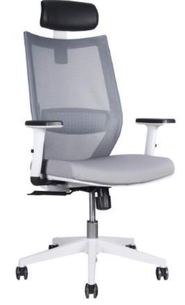 Silla con mecanismo sincrónico, fijación en múltiples posiciones y sistema de tensión regulable. Cabecero de PU regulable en altura y ángulo. Respaldo de malla con soporte lumbar ajustable en altura y apoyabrazos de PU graduables en altura. Asiento de espuma inyectada tapizado, gas de 100 mm, base de nylon 680 mm y ruedas de PU gris de 60 mm.