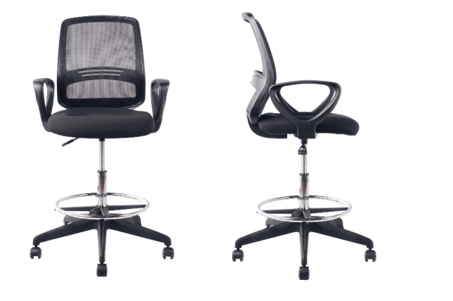 Silla Cajero respaldo bajo en malla, asiento tapizado negro. Brazos regulables en altura, mecanismo reclinable.