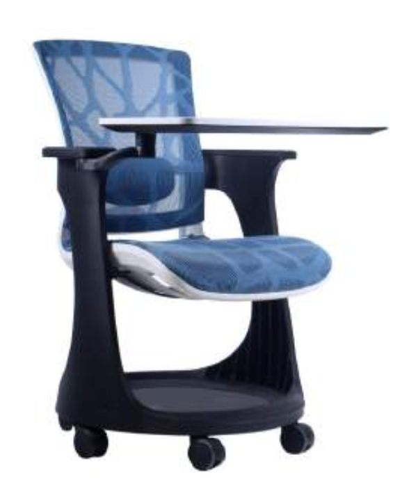 Silla universitaria con respaldo y asiento de malla en color a elección. Estructura de aluminio negro, con apoyabrazos en PU y base de seis ruedas. Paleta de escritura en PP ajustable.