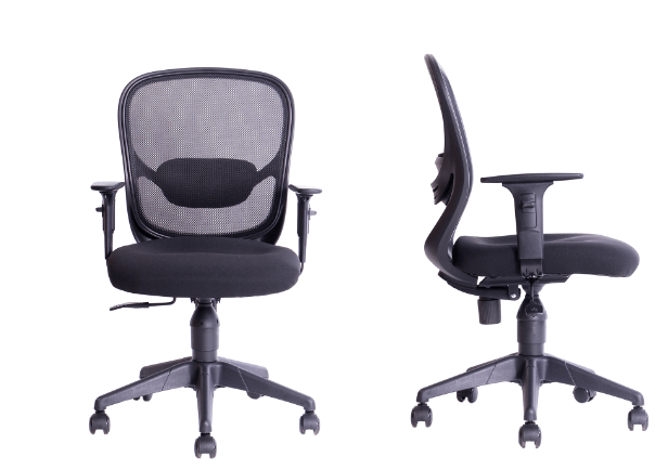 Silla Ejecutiva respaldo bajo en malla con cojin lumbar . Asiento tapizado negro, brazos regulable en altura.